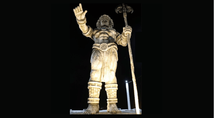 La estatua del dios Chaac fue una inversión de 400 mil pesos. Tiene un peso de 800 kilogramos y mide 6 metros de altura. Está tallada y modelada en polietileno, con tres capas de fibra de vidrio y con un interior de herrería.