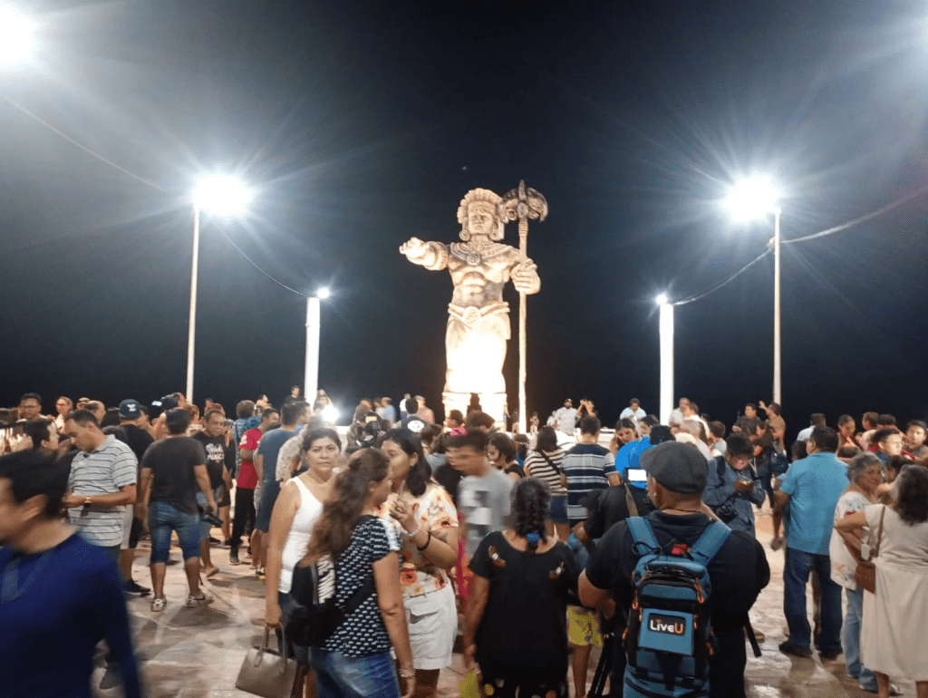En el muelle se congregaron familias y grupos de turistas que aprovecharon el momento para tomarse fotografías con la estatua de el dios maya del agua.