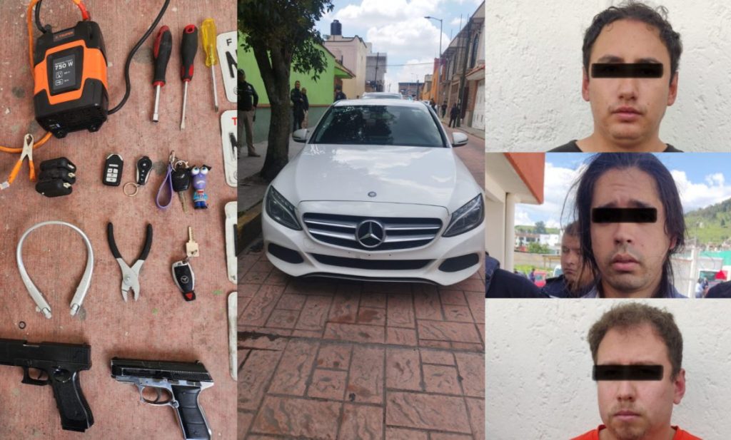 Atendiendo los procedimientos establecidos en la ley, se logró la detención de quienes dijeron llamarse Urian; Alfredo, Rodrigo y Juan Diego, originarios de Jalisco. Al realizar la revisión legal, se les localizaron dos armas de fuego tipo escuadra, un escáner, 4 juegos de llaves de vehículos alta gama, una placa frontal, desarmador, multímetro, inhibidor de señal, pinzas, llave española, herramientas diversas, tarjetas bancarias, identificaciones ajenas y cuatro juegos de placas, algunas con reporte de robo de vehículos en Metepec, Mercado Juárez, Capultitlán y colonia Valle Verde. Fueron trasladados ante la Agencia del Ministerio Público de la Fiscalía Especializada en la Investigación del delito de robo de vehículo para determinar su situación jurídica.