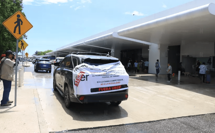 Por considerarla ilegal, transportistas turísticos con placas federales protestaron en el Aeropuerto Internacional de Cancún en contra de la operación de la plataforma Uber. La caravana generó caos en el tránsito vial en dicho lugar.