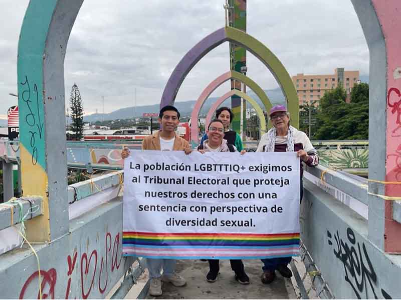 Acompañada por integrantes del colectivo LGBTTI, la activista por los derechos de la comunidad de la diversidad sexual, María Teresa Campos Flores, protestó en el “Puente de Colores” de esta ciudad, para exigir al Tribunal Electoral local que se garantice la representatividad de la diversidad sexual en el Congreso del Estado.