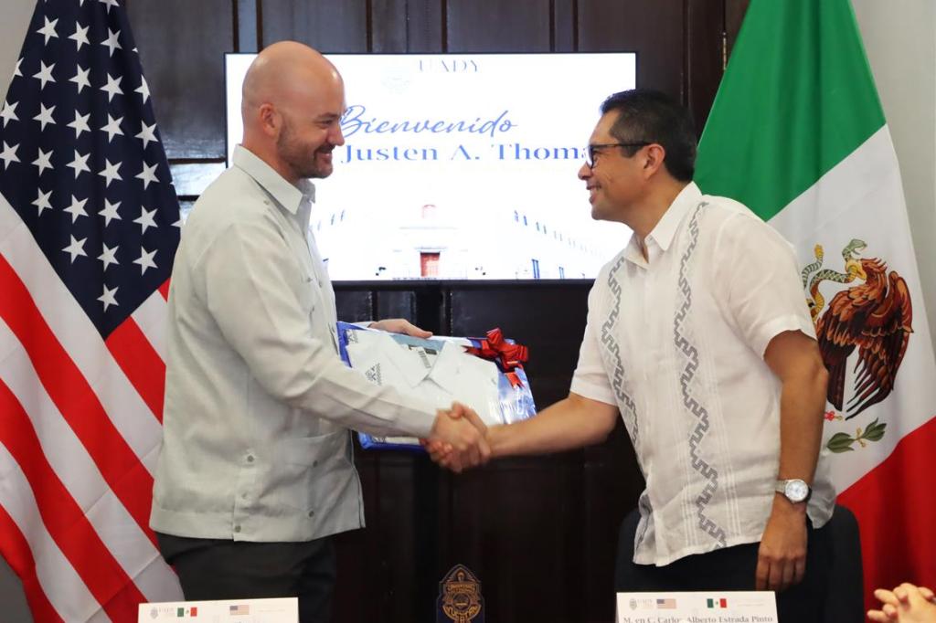 El rector de la Universidad Autónoma de Yucatán (UADY), Carlos Alberto Estrada Pinto, sostuvo un cordial encuentro con el nuevo Cónsul de Estados Unidos en Mérida, Justen A. Thomas, a quien recibió en las instalaciones del Centro Cultural Universitario.