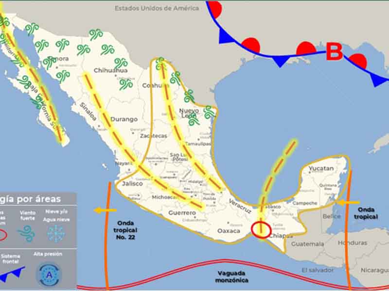 De acuerdo al pronóstico meteorológico de la Comisión Nacional del Agua (Conagua), para los días 15, 16 y 17 de septiembre del presente año, se tiene pronosticado lluvias muy fuertes con puntuales intensas (75 a 150 mm); principalmente, en las regiones norte, Frailesca, Sierra, Istmo-Costa y Soconusco.Asimismo, para el miércoles 18 del mismo mes, se prevén intervalos de chubascos con lluvias puntuales fuertes (25 a 50 mm). Cabe destacar que, todas las lluvias pronosticadas podrían estar acompañadas con fuertes rachas de viento y posible caída de granizo.Por su parte, la Onda Tropical No. 22 se extenderá frente a las costas de Jalisco, reforzando la probabilidad de lluvias en el occidente del país. Continuará avanzando hacia el oeste y dejará de afectar al territorio nacional al final del día.A su vez, la tormenta tropical Ileana se desplazará sobre el golfo de California, debilitándose gradualmente, la cual ocasionará lluvias puntuales torrenciales en el sur de Sonora y norte de Sinaloa; así como lluvias fuertes a muy fuertes en Baja California Sur, Chihuahua y Durango.Pero, se mantendrá ambiente cálido a caluroso con temperaturas máximas de 35 a 40 °C en zonas de Baja California, Sonora, Coahuila, Nuevo León, Tamaulipas, Chiapas, Tabasco, Campeche, Yucatán y Quintana RooSin embargo, la Secretaría de Protección Civil de Chiapas recomienda a la ciudadanía a permanecer atento a los mensajes que emitan las autoridades, abrigarse y evitar salir a la calle cuando se presenten precipitaciones fuertes.Asimismo, se le exhorta a la ciudadanía a vacunarse contra la influencia y el covid-19 con la finalidad de fortalecer las defensas del cuerpo. También, ante los golpes de calor, es importante evitar consumir comida de la calle, para no contraer enfermedades gastrointestinales.