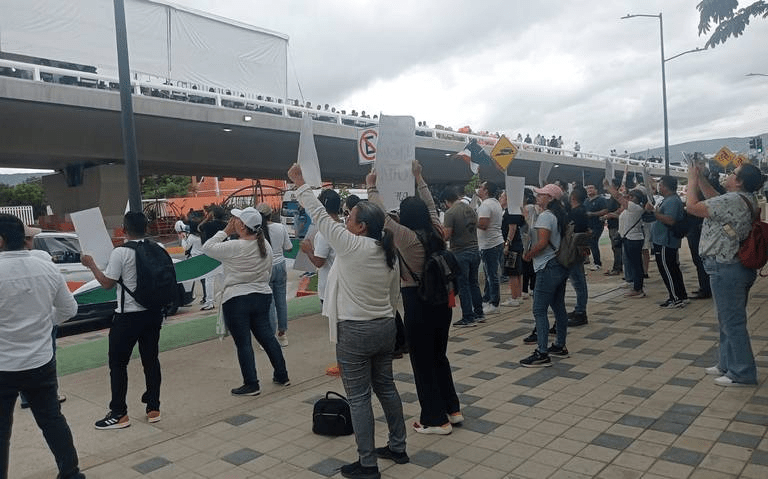 Trabajadores del Poder Judicial Federal se manifestaron en el libramiento norte oriente y la calzada Andrés Serra Rojas, donde se llevaba a cabo la apertura del Paso a Desnivel Torre Chiapas en Tuxtla Gutiérrez.