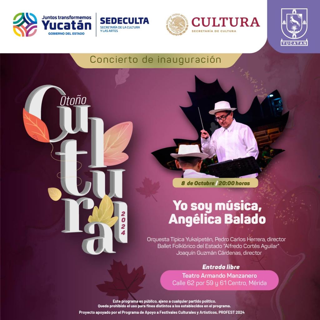 Para celebrar 40 años de existencia del Otoño Cultural se ha preparado un evento inaugural en el que el legado de la compositora Angélica Balado se dejará escuchar a través del concierto titulado Yo soy música, Angélica Balado, a cargo de la Orquesta Típica Yukalpetén (OTY) bajo la batuta del maestro Pedro Carlos Herrera. El homenaje musical tendrá lugar el 8 de octubre a las 20:00 horas en el teatro “Armando Manzanero”.