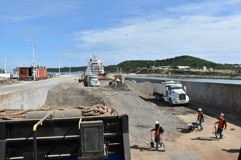 Ceballos Fuentes dijo que el muelle se conforma por estructuras de concreto reforzado: 10 duques de alba, 3 plataformas (10 x 45 m), 3 pasarelas de acceso (10 x 15 m) y pasarelas peatonales (1.50 m de ancho) para unir las plataformas a los duques, las cuales se dividen en tres frentes de atraque y están considerados para recibir embarcaciones de tipo barcaza y carguero en el último.