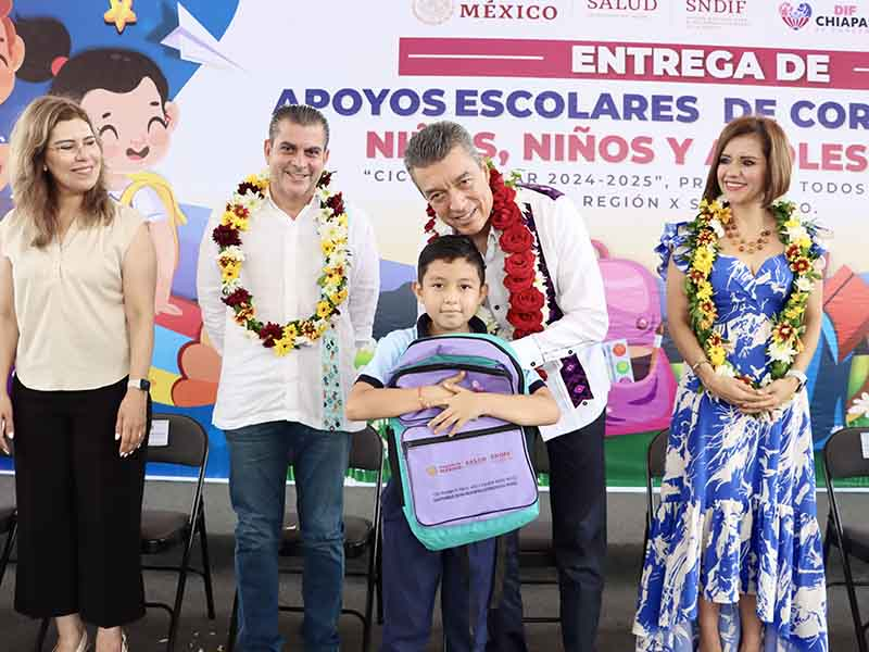 A su vez, la directora general del Sistema DIF Chiapas, Karina Martínez López, señaló que a través del Programa “Todos a la Escuela”, en esta ocasión se entregaron más de 900 paquetes de mochilas y útiles escolares a estudiantes de entre 7 y 14 años de edad, de los niveles de primaria y secundaria. Mencionó que con esta distribución culmina al 100 por ciento la repartición de paquetes en la Región Soconusco.