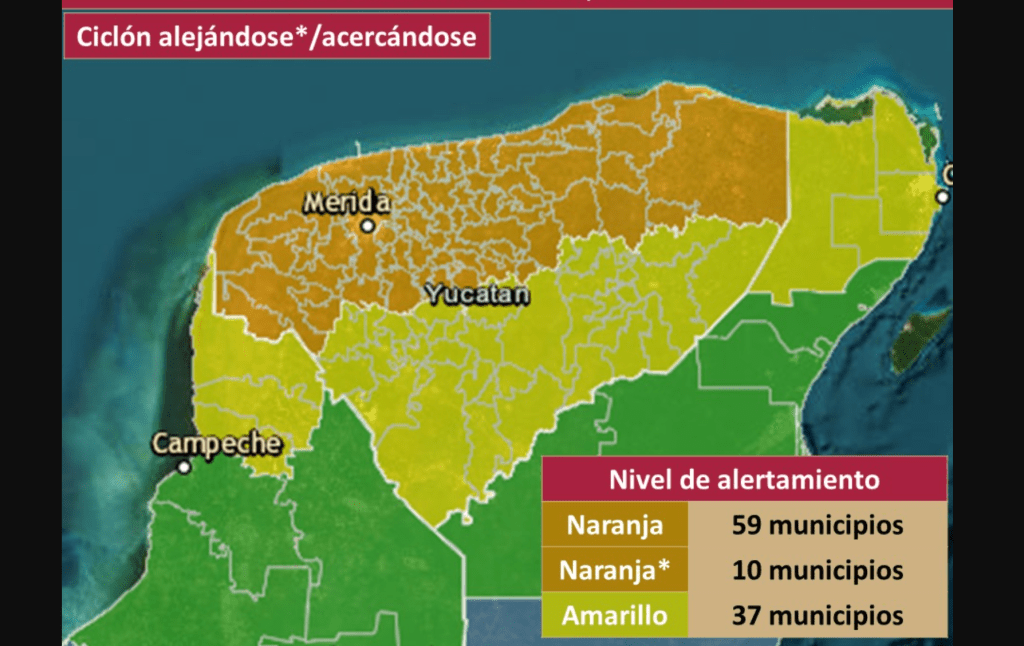 Debido a que el alejamiento del huracán Milton ha reducido el nivel de riesgo para el territorio yucateco, la Coordinación Estatal de Protección Civil (Procivy) retirará la Alerta Roja para el norte del estado y establecerá Alerta Naranja en Zona Costera y Alerta Amarilla para la mitad sur. Aunque el fenómeno continúa alejándose de Yucatán y se ha degradado a categoría 4, sus efectos todavía estarán presentes durante todo este martes 8 de octubre, por lo que el peligro aún es alto, principalmente en los municipios costeros. La provincia detalló que son 69 municipios en Alerta Naranja y 37 en alerta amarilla. A las 6 de la mañana de este martes, el huracán Milton categoría 4, se localizó a 120 kilómetros al noroeste de Río Lagartos y 165 kilómetros al noreste de Progreso. Se mueve hacia el este-noreste a 19 km/h con vientos de 230 km/hy rachas superiores.