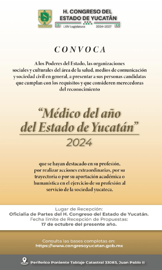 El H. Congreso del Estado de Yucatán ha lanzado una convocatoria dirigida a los Poderes del Estado, organizaciones sociales y culturales del área de la salud, medios de comunicación y a la sociedad civil en general, para proponer a candidatos y candidatas que puedan ser merecedores del reconocimiento “Médico del Año del Estado de Yucatán” 2024.