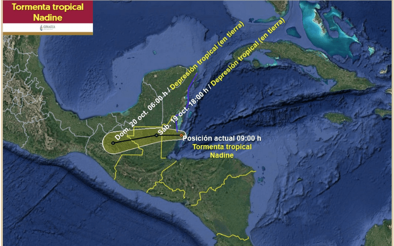 La tormenta tropical Nadine se desplaza hacia el norte de Belice sobre el mar Caribe, ubicada aproximadamente a 70 km al sur de Chetumal, Quintana Roo, y se espera que impacte la región alrededor del mediodía. Para las 09:00 horas, la Comisión Nacional del Agua (Conagua) reportó que la circulación de Nadine, en interacción con el frente No. 4, ha comenzado a generar un temporal de lluvias intensas a torrenciales en el sureste de México, afectando diversas entidades, incluyendo Chiapas.