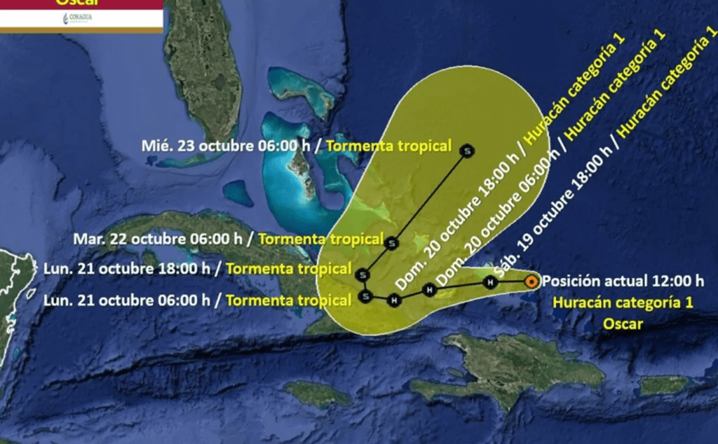 ‘Óscar’ que hace unas horas era tormenta tropical, se ha intensificado la tarde de este sábado 19 de octubre a huracán categoría 1 en la escala Saffir-Simpson.