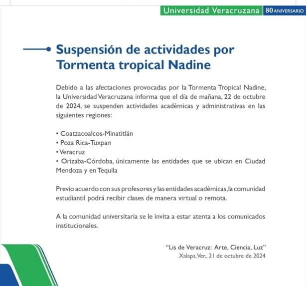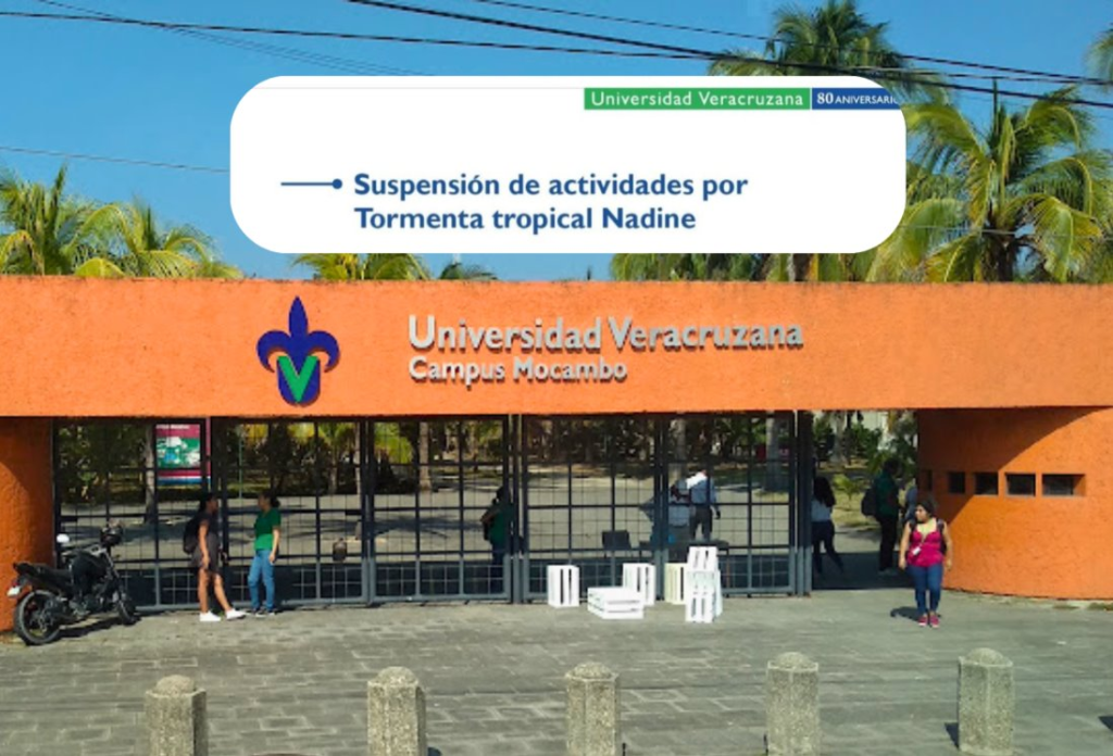 Señalaron que las afectaciones que se provocaron por el paso de la tormenta tropical Nadine sobre la entidad veracruzana crearon que se tenga una suspensión de clases en actividades académicas, esto para evitar poner en riesgo a la comunidad estudiantil.