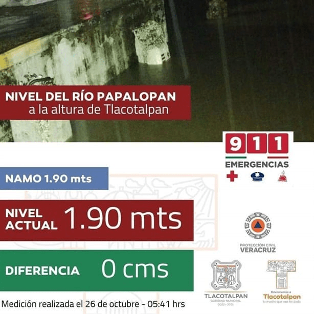 Debido a esta situación, se ha realizado el monitoreo del río Papaloapan, de acuerdo con el informe de Protección Civil de Veracruz, los niveles del río Papaloapan se encuentran en 1.90 metros, esto de acuerdo a la última medición realizada a las 5:41 de la madrugada de este sábado 26 de octubre.