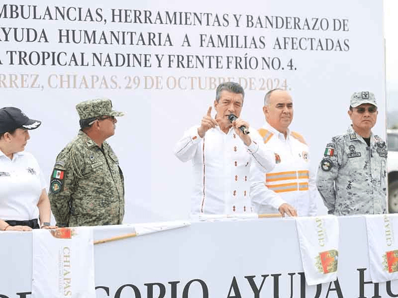 Al dar el banderazo a la entrega de ayuda humanitaria a la población afectada por la tormenta tropical “Nadine” y el frente frío no. 4, el gobernador Rutilio Escandón Cadenas destacó que, ahora más que nunca, las autoridades federales, estatales y municipales han puesto a disposición del pueblo todos los recursos humanos y materiales para atender a las personas que más lo requieren y restablecer los daños materiales causados por los fenómenos naturales.