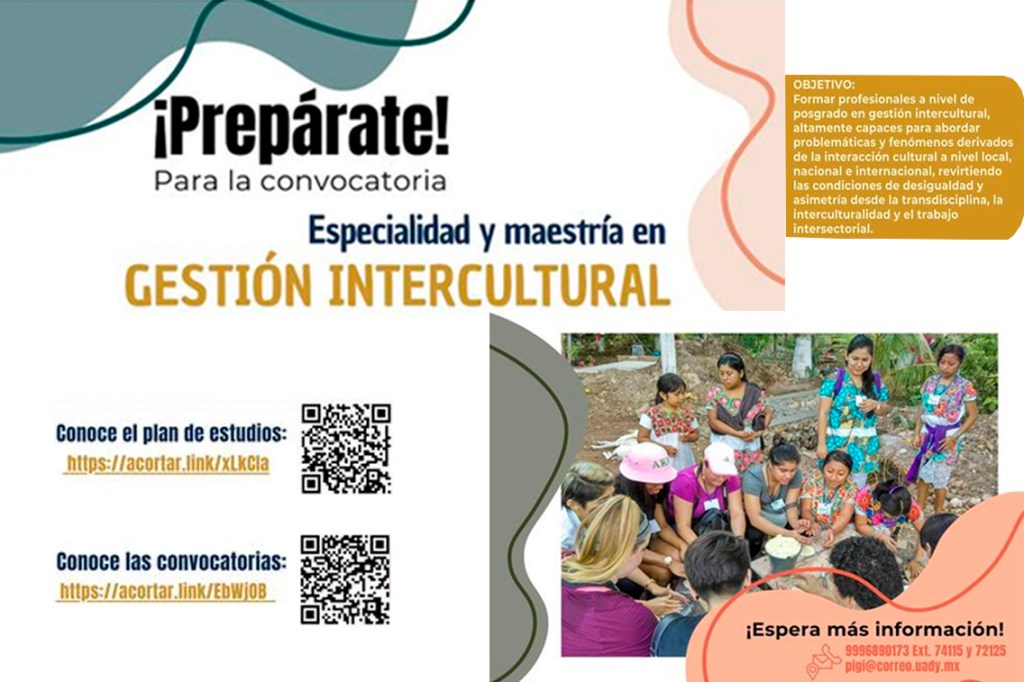 La Universidad Autónoma de Yucatán (UADY), a través de su Unidad de Proyectos Sociales, invita a estudiantes y académicos, así como público en general, a cursar la Especialidad o Maestría en Gestión Intercultural que tiene como objetivo formar profesionales capaces de abordar problemáticas y fenómenos derivados de la interacción cultural a nivel local, nacional e internacional.