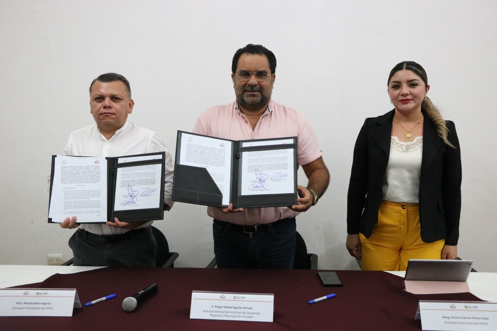 Signaron el documento, por el IEPAC su Presidente Bates Aguilar y el Secretario Ejecutivo Jesús Enrique Uc Ibarra, y por el INDERM su Director General, Aguilar Arroyo. Fungió como testigo de honor en el evento la Consejera Electoral, Pérez Valle, a quienes acompañaron el Consejero Electoral, Carlos Alberto Dzib Pech y la Consejera Electoral, Ariana del Socorro Couoh Osorio; así como la directora de Vinculación del INDERM, Mayra Nah Dzul.