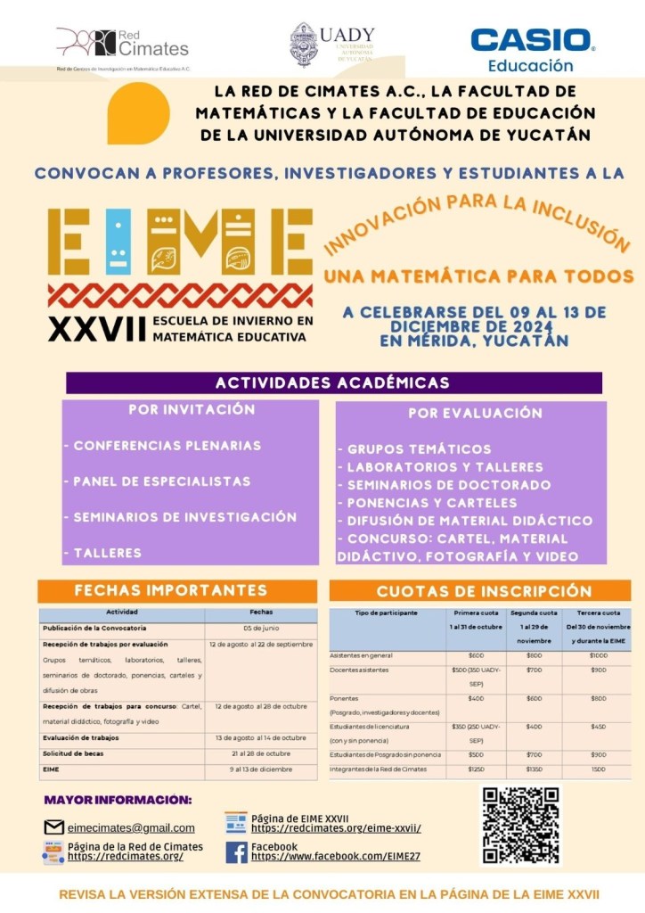 Del 9 al 13 de diciembre se llevará a cabo en la Universidad Autónoma de Yucatán la XXVII Escuela de Invierno en Matemática Educativa (EIME), organizado por la Red de Centros de Investigación en Matemática Educativa (Red de Cimates) en colaboración con las Facultades de Matemáticas y de Educación.