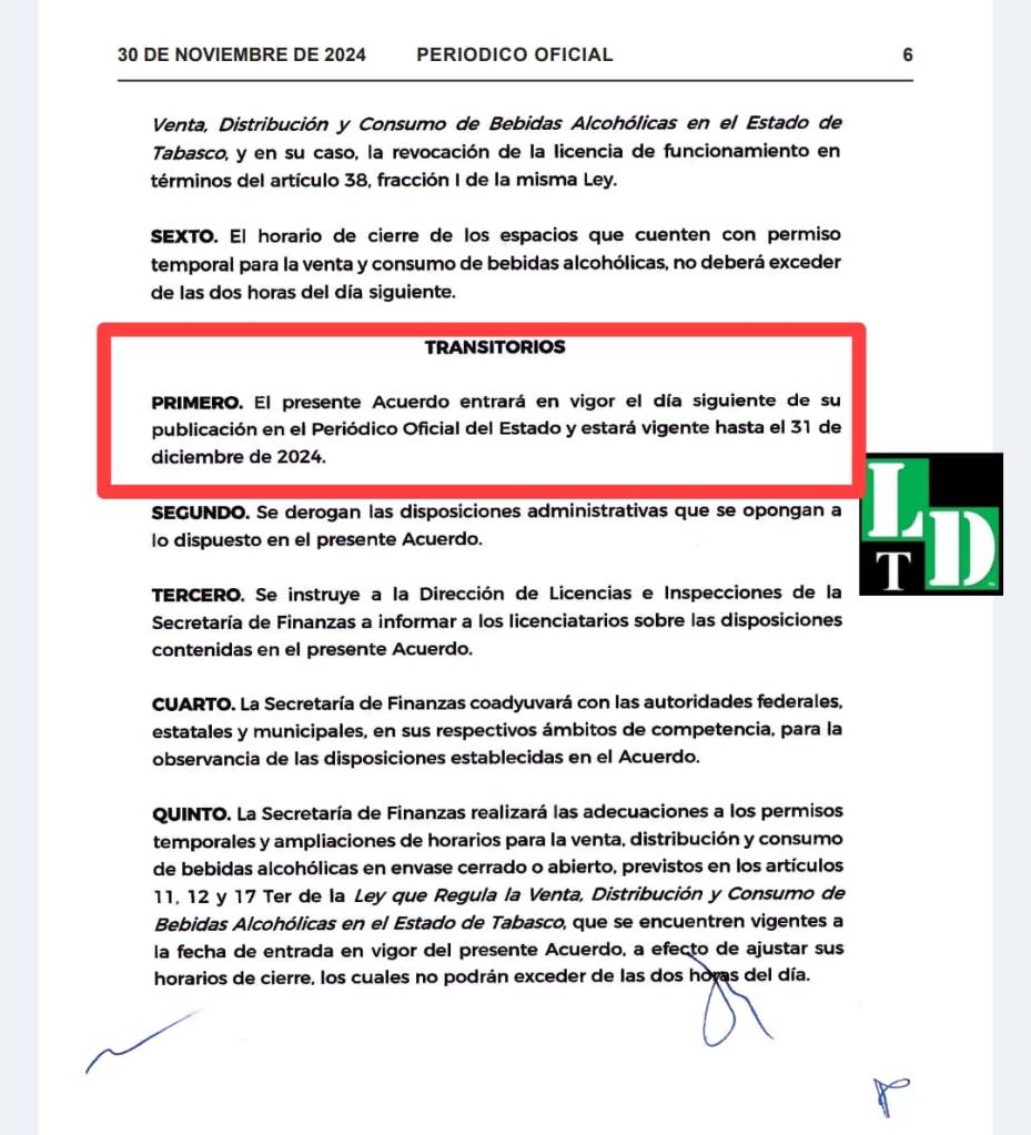 Villahermosa, Tabasco; 30 de noviembre del 2024.- El gobierno ha emitido el Decreto por medio del cuál modifica los horarios de venta y consumo para los establecimientos que expenden y venden bebidas alcohólicas destapadas.
