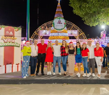 El presidente municipal de Tulum, Diego Castañón Trejo, encabezó el encendido de luces de la villa navideña, instalada en los bajos del palacio municipal.