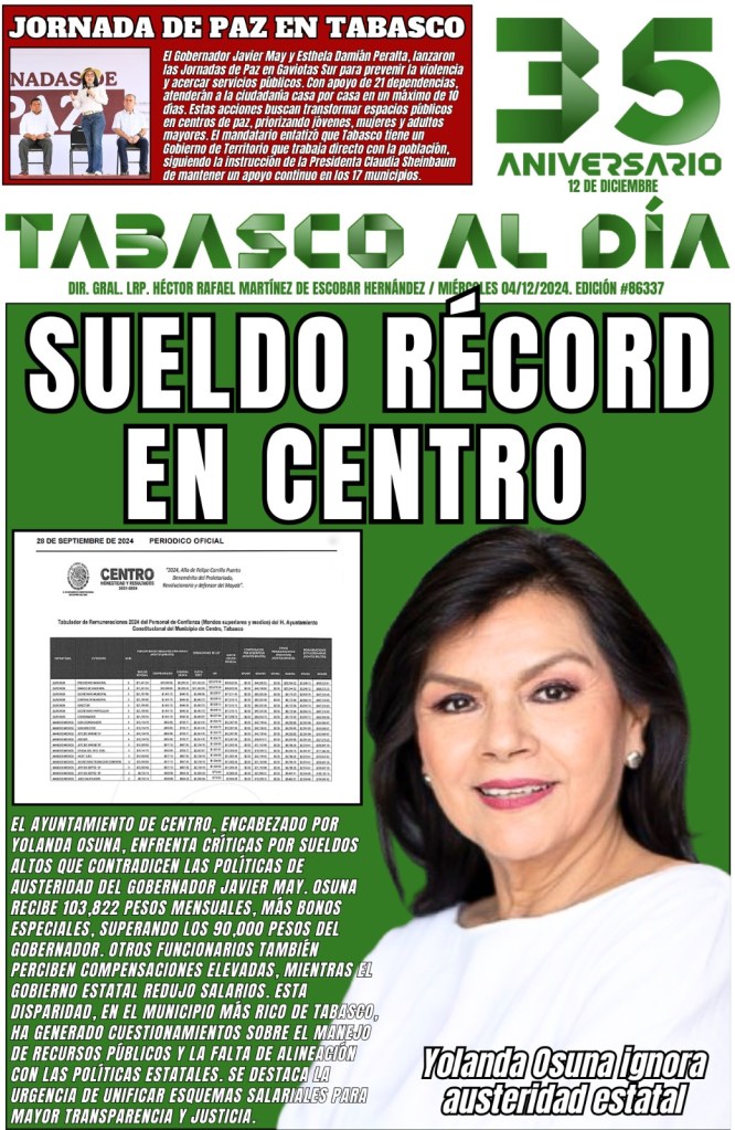 El Ayuntamiento de Centro, encabezado por Yolanda Osuna Huerta, enfrenta críticas por mantener un esquema salarial que contrasta con las políticas de austeridad promovidas por el gobernador de Tabasco, Javier May Rodríguez. A pesar del decreto estatal que limita los sueldos, Osuna Huerta percibe un ingreso mensual de 103,822 pesos, compuesto por 59,622 pesos de sueldo base y 44,200 pesos como compensación por desempeño. Este monto supera los 90,000 pesos que percibe el gobernador desde el 27 de octubre, como parte de una política de austeridad republicana anunciada en su campaña y ratificada al inicio de su gobierno.
