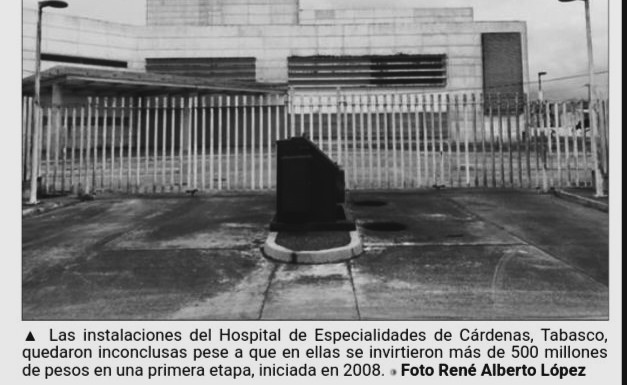 El Hospital Regional de Especialidades de Cárdenas y el tema de terminar su edificación, botada por los gobiernos de Arturo Núñez y las administraciones de la dupla Adán Augusto y Carlos Merino, han hecho correr ríos de tinta, pues esos dos sexenios le hicieron el feo a la obra comenzada en la gestión del priísta Andrés Granier.