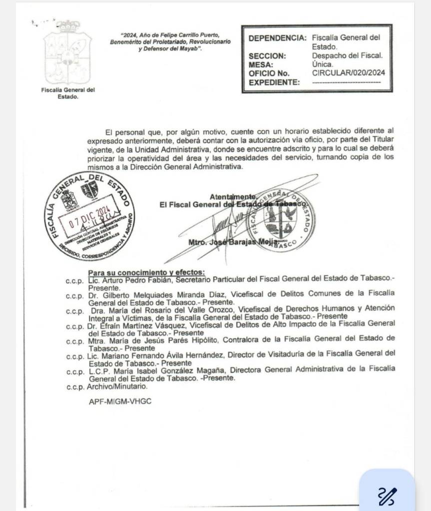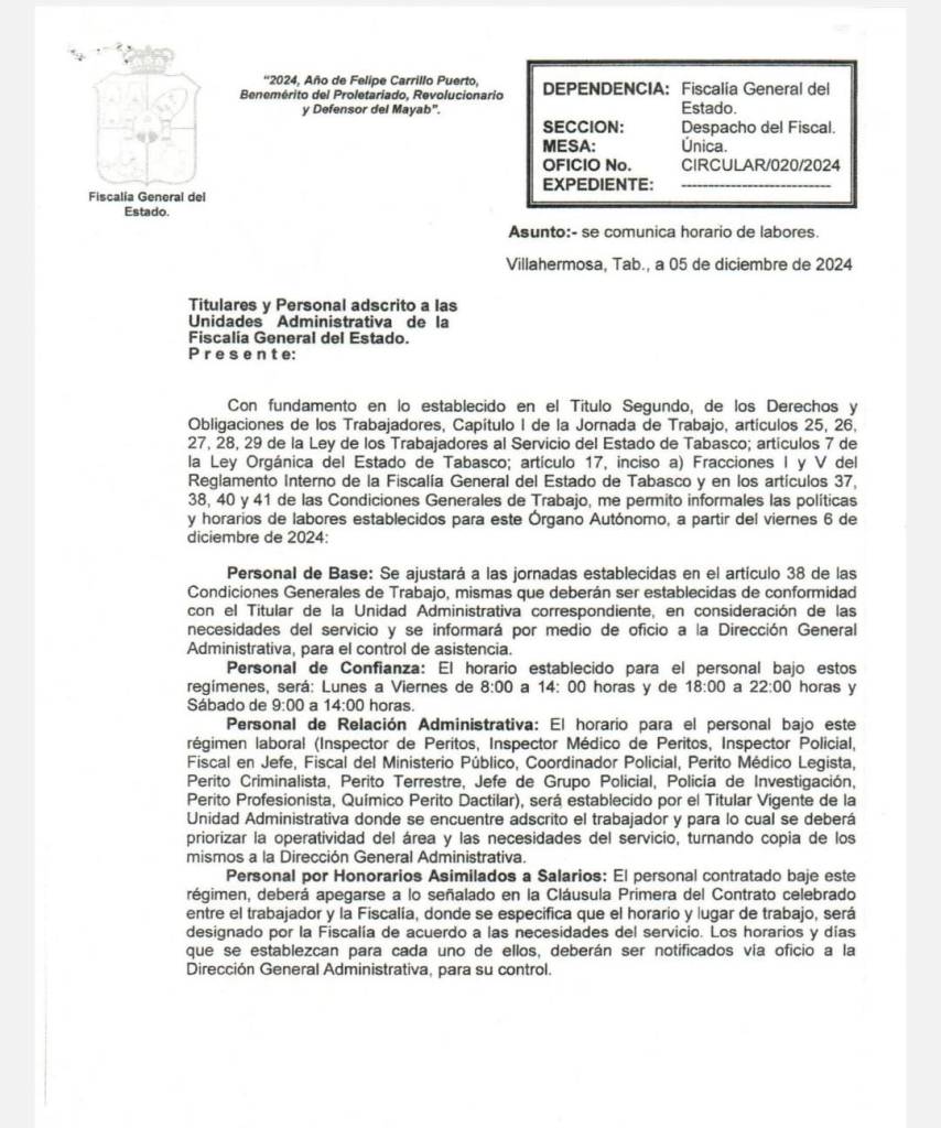 Trabajadores de la Fiscalía nos hacen llegar el documento oficial que resulta ser una Circular bajo el número 020/2024, y firmada por el titular antes mencionado, y donde se dan a conocer los nuevos horarios para todos.
