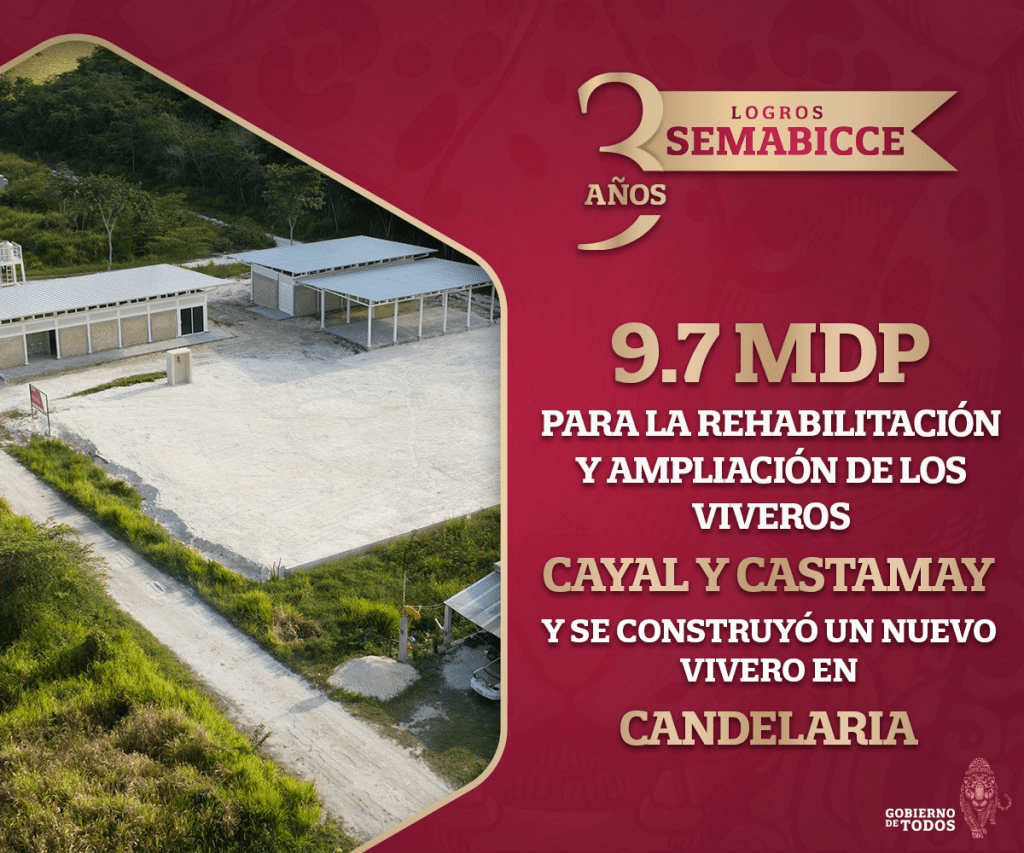En el caso del vivero ubicado en Castamay, denominado “Santa Cristina”, se invirtieron $3,423,396.37 pesos en la construcción de una bodega, área de producción, ala de trasplante y un sistema de abastecimiento de agua. En el nuevo Vivero Candelaria, se construyeron los espacios de producción, almacenamiento, trasplante y área de plantación, contando con instalaciones nuevas ubicadas dentro del área urbana de la ciudad de Candelaria, con una inversión de $3,861,345.52 pesos. Finalmente, en el Vivero Cayal, se invirtieron $2,434,037.45 pesos en la construcción del área de sanitarios y un sistema de riego por aspersión para mejorar la irrigación en el área de plantaciones.