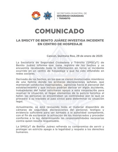 Por su parte, la Secretaría Municipal de Seguridad Ciudadana y Tránsito (SMSCYT) dijo que tiene registros del incidente y está revisando cámaras y testimonios. Según su versión, los turistas estaban alterados y podrían haber causado un accidente, por lo que el hotel pidió apoyo. Cuando llegaron los agentes, la situación ya estaba bajo control, así que solo procedieron a llevarse a los involucrados con el juez cívico.