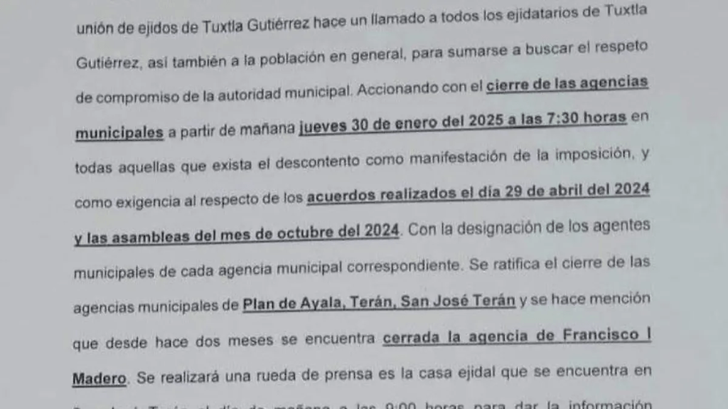 Ante ello ejidatarios de Plan de Ayala y San José Terán acusan al presidente municipal Ángel Torres Culebro ante la falta de compromiso y de palabara acordados durante campaña política en reunión con líderes ejidales, de acuerdo con Luis Antonio Chay Jiménez, presidente de la Unión de Ejidos en Tuxtla Gutiérrez fue el 29 de 2024 que se legaron a estos acuerdos los cuales no se cumplieron.
