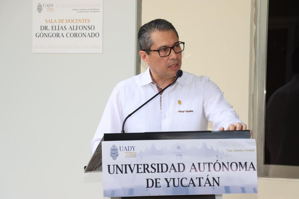 Al hacer uso de la palabra, el rector de la UADY, Carlos Alberto Estrada Pinto, afirmó que no hay mejor manera de reconocer toda la labor que ha realizado el Doctor Góngora Coronado que el poder dedicarle estas salas destinadas a las y los docentes y que están enfocados a una parte fundamental de la visión del profesor investigador.