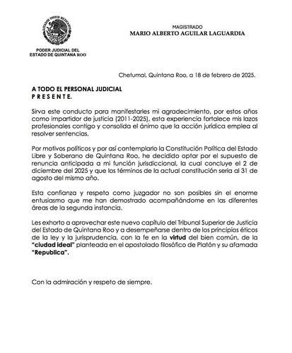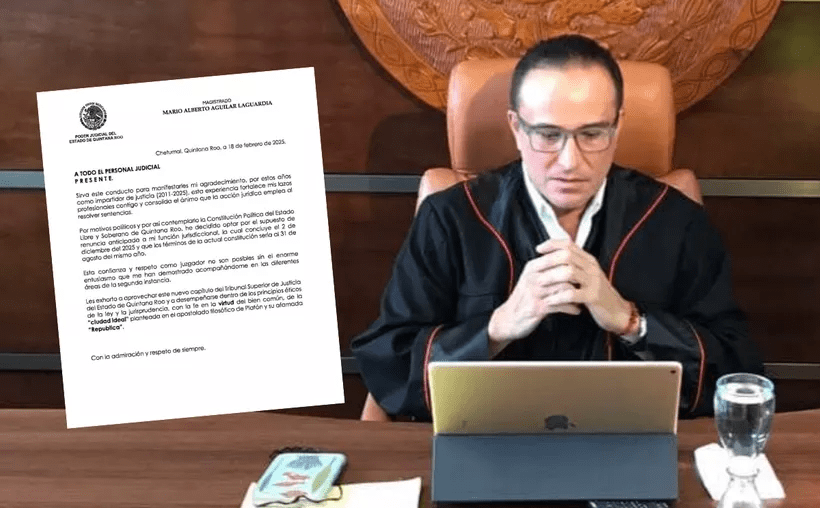 Durante la tarde del martes 18 de febrero, trascendió la renuncia de Mario Aguilar Laguardia, magistrado numerario del Poder Judicial de Quintana Roo. A través de una carta dirigida al personal judicial, Aguilar Laguardia anunció el fin de su labor como impartidor de justicia, cargo que ocupó desde 2011 y que estaba previsto concluir en diciembre de este 2025.
