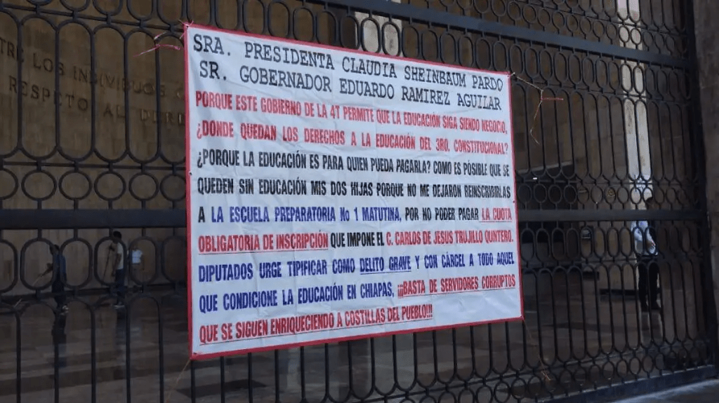 El padre de familia colocó una cartulina en el barandal del Congreso del Estado con mensajes dirigidos a la presidenta Claudia Sheinbaum Pardo y al gobernador del Estado, Eduardo Ramírez Aguilar, denunciando la imposición de una cuota sin que esta haya sido aprobada por los padres de familia en una asamblea.
