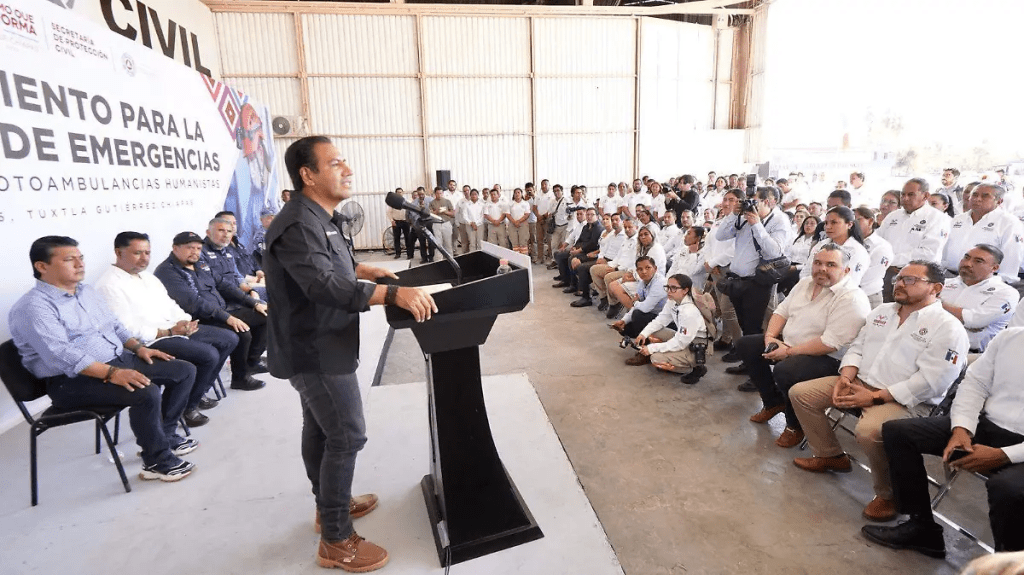 Al entregar nuevo equipamiento para la atención de emergencias, consistente en ambulancias y motoambulancias para fortalecer las capacidades operativas de la Secretaría de Protección Civil, el gobernador Eduardo Ramírez Aguilar reconoció la labor de esta institución en beneficio del pueblo de Chiapas y destacó que es un ejemplo a nivel nacional.