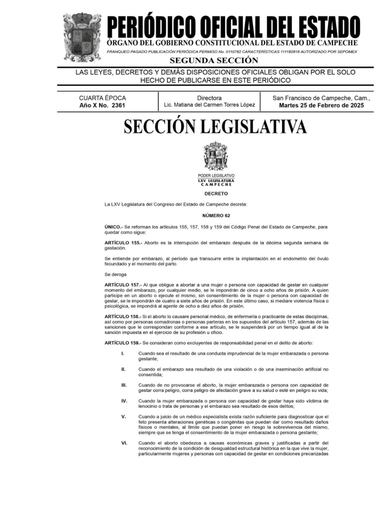 La reforma al Código Penal de la entidad, que fue aprobada por diputados locales en sesión privada del pasado martes 24 de febrero, ya fue publicada en el Periódico Oficial del Estado de Campeche (POEC), durante la edición del pasado martes 25 de este mes, un día después de la sesión reservada de la 65 Legislatura.