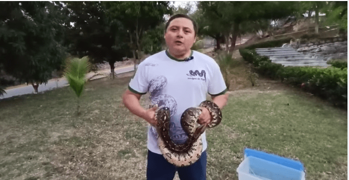 El biólogo Hunnacceel Uc Bacab sostiene con confianza a su inseparable boa Max durante una de sus presentaciones.