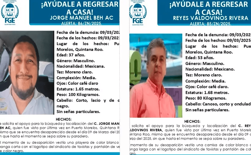La Fiscalía General del Estado de Quintana Roo mantiene abierta una investigación por la desaparición de dos integrantes del sindicato de taxistas de Puerto Morelos. Los hombres fueron privados de su libertad el pasado 9 de marzo, según confirmó la autoridad ministerial.