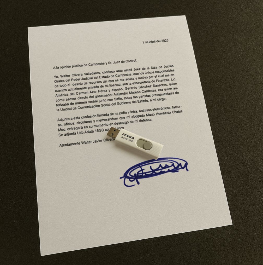 Campeche, México.- Al sentirse abandonado por su ex jefe, Alejandro Moreno Cárdenas, su Vocero durante su administración, Walter Olivera Valladares, rompe el silencio, y desde prisión, manda pruebas al Juez para demostrar su inocencia, y responsabiliza a la ex Secretaria de Finanzas, a su marido (sobrino de la gobernadora Layda Sansores).