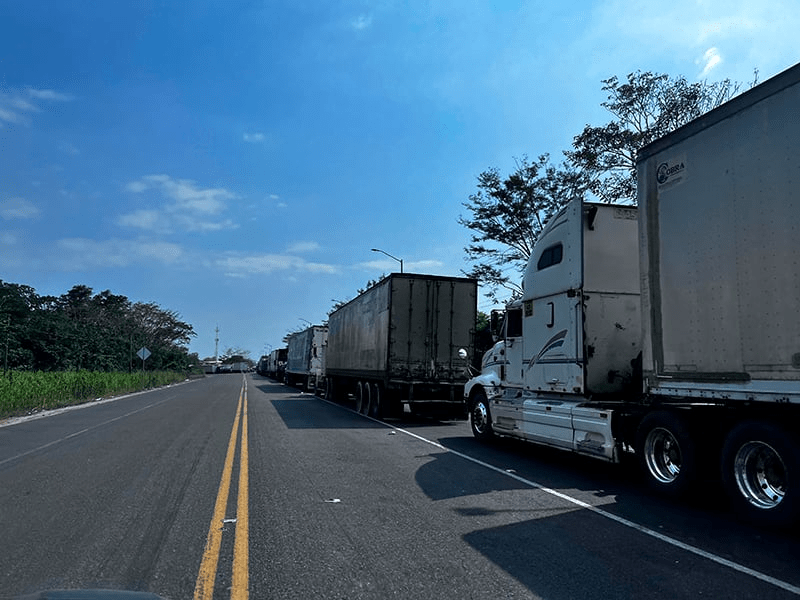 Los traileros se mantienen estacionados a orilla de la carretera Tapachula- Ciudad Hidalgo, muy cerca del acceso a esta población, donde se ha generado caos vehicular debido a las maniobras que realizan para estacionarse o encaminarse hacia dicho puerto.