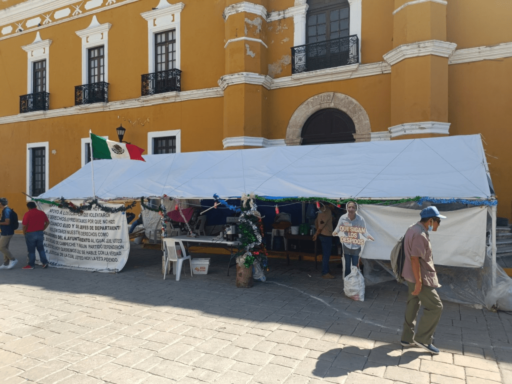 Bajo esta carpa, afuera Palacio Municipal, extrabajadores despedidos han resistido días de indiferencia. Aquí pasaron Navidad, Año Nuevo y cada jornada de lucha, esperando justicia