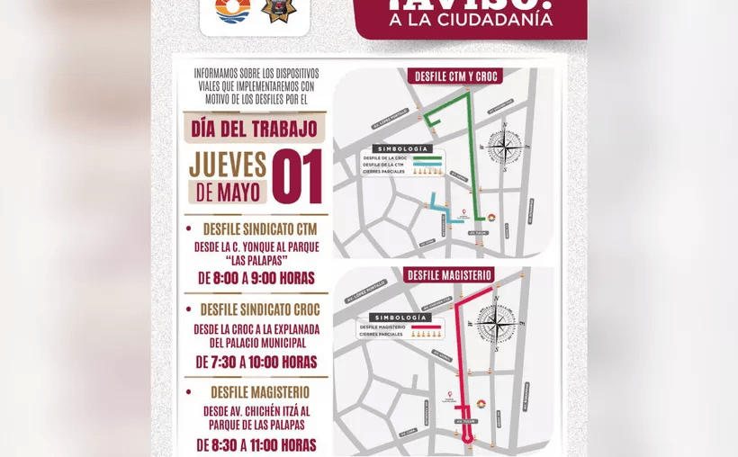 - De 08:30 a 11:00 horas: cierre vial desde la Avenida Chichén Itzá hasta el Parque de Las Palapas por el desfile del Magisterio.