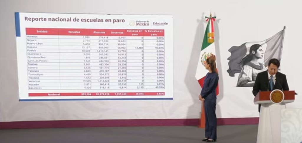 Esto deja a ocho entidades con escuelas que estuvieron en paro, el pasado viernes: Baja California Sur (14% de escuelas en paro), Chiapas (18%), Chihuahua (4%), Ciudad de México (2%), Guerrero (13%), Yucatán (4%), Zacatecas (49%) y Oaxaca (95%).