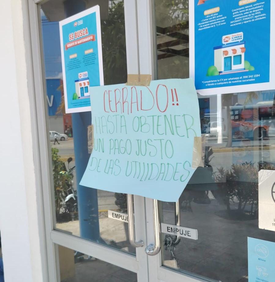 El personal de la sucursal en la avenida Xcaret, frente al supermercado Walmart, colocó una cartulina en la puerta principal, con la leyenda “Cerrado hasta obtener un pago justo de las utilidades”, para luego comenzar a manifestarse de manera pacífica, afuera de este local.