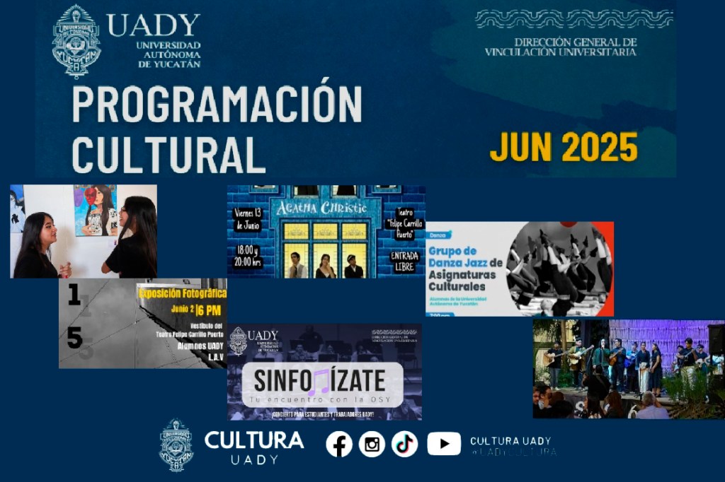 La Coordinación de Cultura para el Desarrollo de la Universidad Autónoma de Yucatán (UADY) invita a la comunidad universitaria y al público en general a participar en las diversas actividades culturales programadas para el mes de junio.