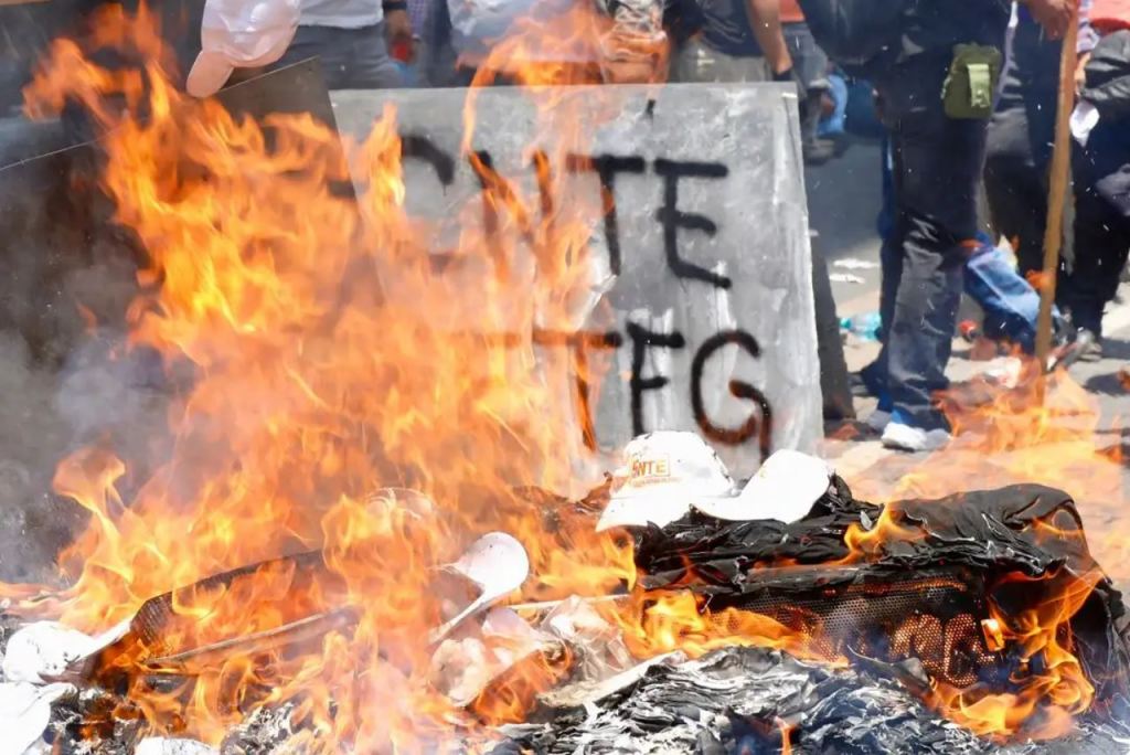 Mientras tanto, continuó la quema de objetos extraídos del inmueble, como sillas, bocinas, gorras, camisetas, cajas de cartón, botes de basura e imágenes del líder nacional del SNTE.