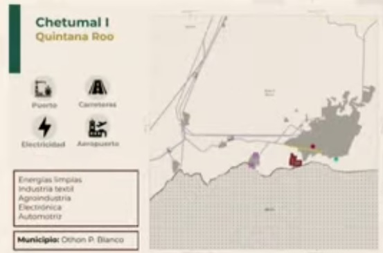 De acuerdo a la ficha técnica compartida en la conferencia, este Polo del Bienestar, establecido en un predio denominado “Chetumal 1”, contará con inversiones en energía limpia, industria textil, agroindustria, electrónica e industria automotriz.