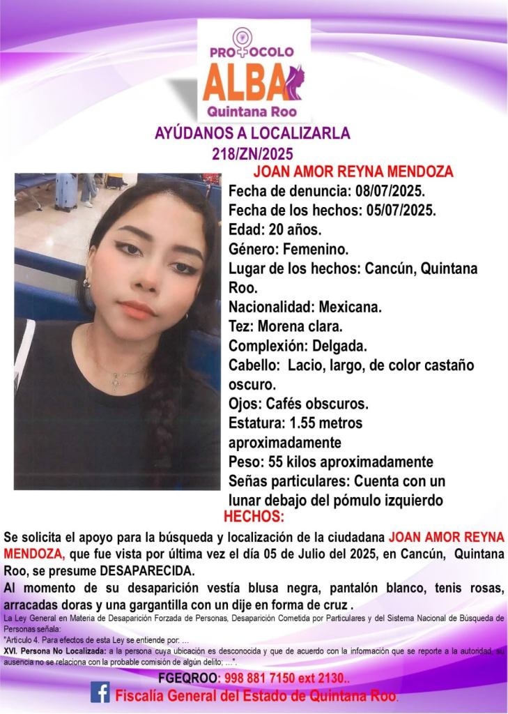Autoridades de Quintana Roo ya han emitido una alerta ALBA por la desaparición de esta joven cancunense, en tanto que la Fiscalía de Jalisco ya investiga el caso. De acuerdo a los datos de geolocalización del celular de la víctima, Joan Amor viajó en avión hasta Guadalajara, desde donde se trasladó por tierra hasta Zapopan; sin embargo, al llegar a la colonia Romo en esa ciudad, su señal se interrumpe.