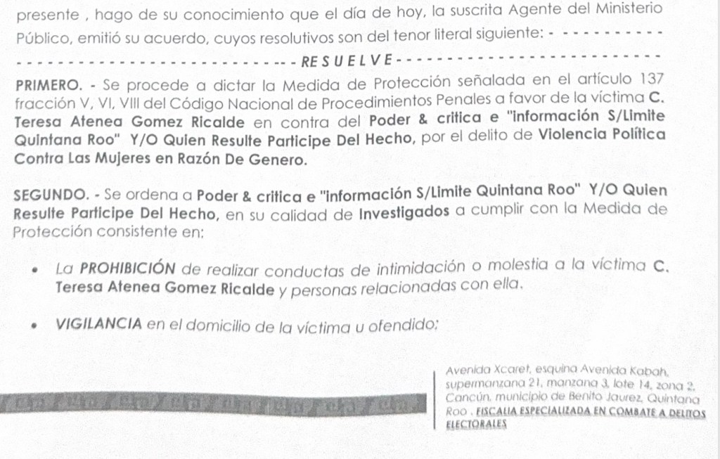 Las medidas de protección derivan de la carpeta de investigación FEMDE/06/2/2025, que lleva la Fiscalía Especializada en Combate a Delitos Electorales, en contra de dos medios de comunicación, “Poder y Crítica” e “Información S/ Límite”, quienes han sido denunciados por conductas intimidatorias contra la edil isleña.