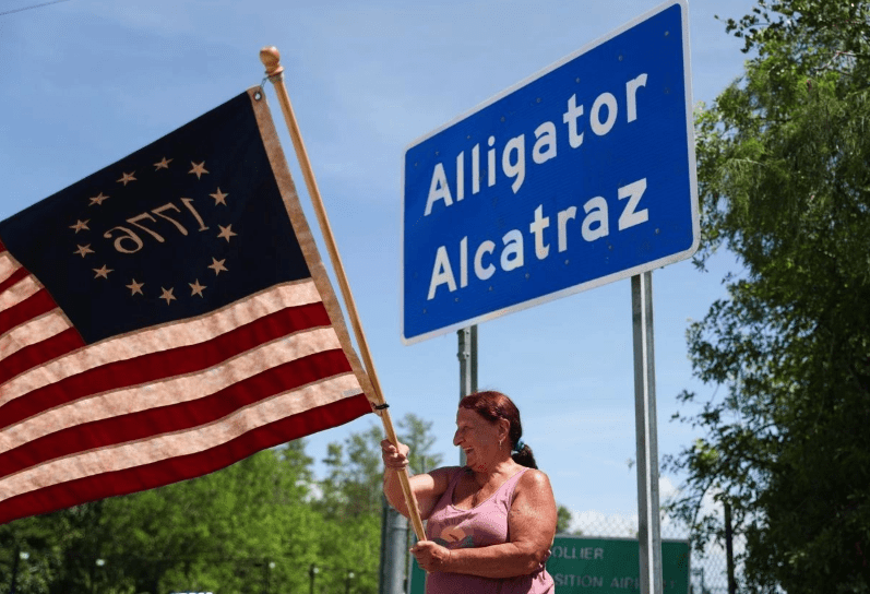 El nombre, Alligator Alcatraz hace referencia a la icónica prisión de San Francisco, que Trump ordenó reabrir próximamente, y a los caimanes que abundan en los alrededores del centro de detención, que según las autoridades reducirán el riesgo de fuga.