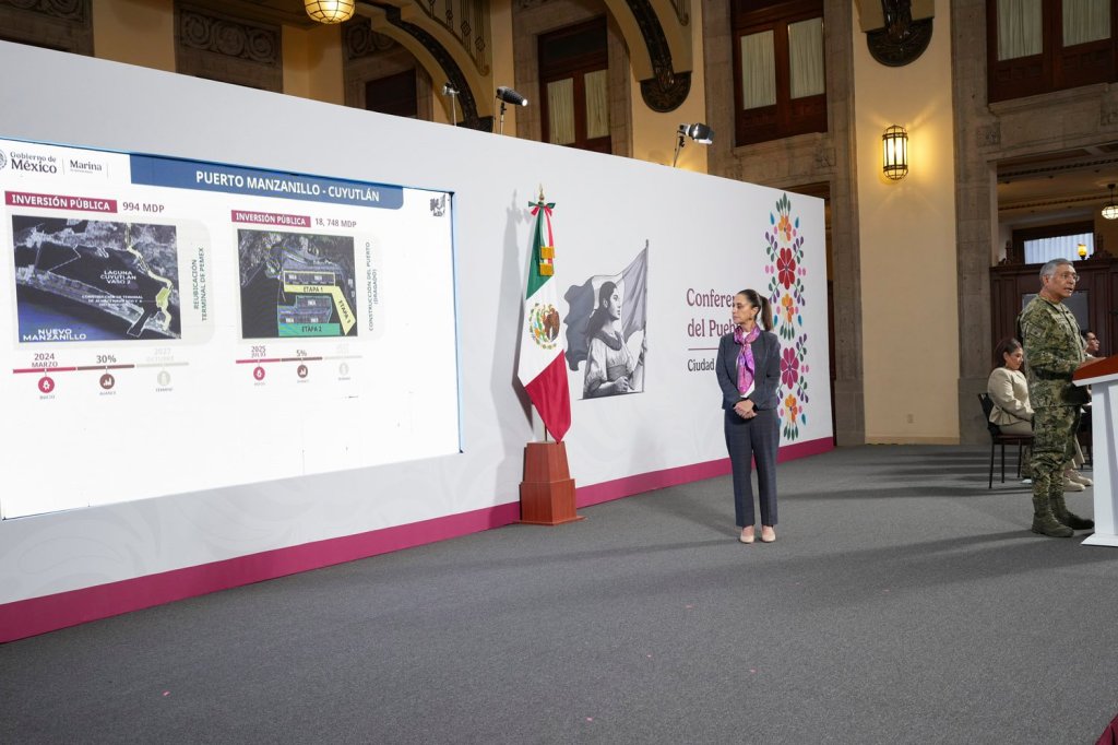 Manzanillo, dijo, “se convertirá en el primer puerto de América Latina”. Para ello se trabaja, por ejemplo, en la reubicación de la terminal de Pemex, para lo que dedicará una inversión de 994 millones de pesos. La obra tiene un avance de 30 por ciento y estará lista en octubre de 2027.