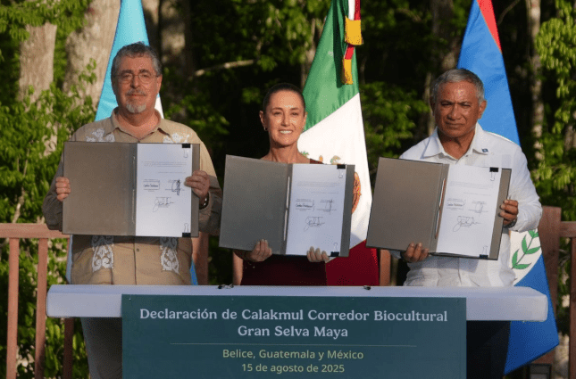 La mandataria mexicana calificó este acuerdo como “histórico” y destacó que hoy reunió a los líderes de los tres países “un objetivo hermoso. quizá ejemplo mundial, nos unimos los tres países para declarar conjuntamente el corredor biocultural Gran Selva Maya”.